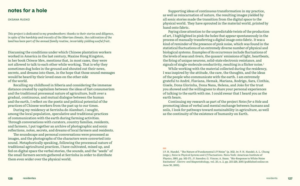 The publication "Resilience: Artistic Residency | Art and Agriculture" documents the research and experimentation of the project's resident artists and curators, as well as the perspective of two guest curators, Clarissa Diniz and Cláudio Oliveira.